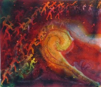 "Die Auswahl meiner Motive ist die Suche nach dem Ursprung. Ich verarbeite in meinen Bildern Ursymbole und versuche Elemente von Ursprung und Moderne miteinander zu verbinden. Die neuen Bilder zeigen Menschen in Bewegung, Abstraktes und Objekte mit verschiedenen Materialien, sowie „Schriftbilder“. Ein Element ist auch immer die Kalligraphie. `Verschriftete Texte veranlassen zu lesen, wo es nichts zu lesen gibt`.“