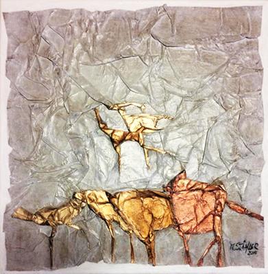 "Savanne" (Inspiration durch die Tierwelt Afrikas), Material: Leinwand, Papier, Acrylfarbe weiß und Goldnuancen, Größe 40 x 40 cm. Papier auf Leinwand befestigt. In Falten gelegt, mit verdünnter weißer Acrylfarbe überzogen. Die Ausmalungen in verschiedenen Goldnuacen aus den Kräuselungen und Falten des Untergrundes herausgelesen.