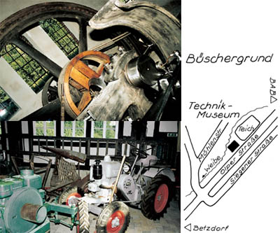 Die alte Dampfmaschine der Leimfabrik Nöll, die als letzter Betrieb dieses traditionellen Industriezweiges im Jahre 1972 geschlossen wurde, ist das Herzstück des neuen Technikmuseums in Freudenberg. Sie stammt aus dem Jahre 1904 und wurde zunächst im Bergbau eingesetzt. Heute treibt sie über eine Transmission mit großen Gelenkwellen eine komplette mechanische Werkstatt an, die das Technikmuseum von der Firma Döring aus Hagen übernommen hat. Das Gebäude des Museums besteht aus drei miteinander verbundenen Bauteilen: einem gemauerten Anbau mit Schleppdach für die Dampfmaschine, einer großen Fachwerkhalle und einem alten Feuerwehr-Spritzenhaus. Die Fachwerkhalle stammt aus dem 10 km entfernten Steeg (bei Friesenhagen) und wurde im Jahre 1952 von der Fürstlich-Hatzfeld`schen Verwaltung als Sägewerk gebaut. Sie hat eine Grundfläche von 40 x 20 Metern und ist 12 Meter hoch. Während dieser Gebäudeteil in typisch Siegerländer Fachwerkbauweise erstellt wurde, ist das angebaute Spritzenhaus im norddeutschen Fachwerkstil errichtet worden. Der Bau dieses ehemaligen städtischen Spritzenhauses auf der Sieghütte in Siegen wurde um 1900 vom damaligen Stadtbaumeister errichtet, der aus Norddeutschland stammte. Das alte Sägewerk wurde an seinem ehemaligen Standort sorgfältig abgebaut und nach Freudenberg transportiert, das Spritzenhaus war bereits zerlegt, Teile des Fachwerks waren jedoch so marode, dass sie nach den alten Plänen wieder neu gezimmert werden mussten. In der alten Sägewerkshalle werden neben Dampfmaschine und mechanischer Werkstatt eine große Anzahl von Nutzfahrzeugen (vor allem Traktoren) und Motorrädern sowie zahlreiche kleinere landwirtschaftliche Maschinen und Geräte gezeigt, die auf der Empore im Dachgeschoss der Halle ihren Platz gefunden haben. Das älteste Exponat des Museums ist eine selbstfahrende Bandsäge aus dem Jahre 1923, das jüngste ein Hanomag-Traktor aus den 1960er-Jahren. Das Spritzenhaus beherbergt als Dauerleihgabe eine Dampfmaschinen-Modellausstellung und wird zudem für Sonderausstellungen genutzt. Hier ist auch ein kleiner gastronomischer Bereich untergebracht. Das Technikmuseum ist auf Initiative des `Vereins der Freunde historischer Fahrzeuge Freudenberg` entstanden. Da der Verein stets auf der Suche nach weiteren Exponaten ist, befindet sich die Ausstellung in ständiger Erweiterung und Veränderung. Eine Ausstellung zur Leim-, Leder- und Filzindustrie in Freudenberg wird zur Zeit erstellt. Für an Motorverkehr und Technik Interessierte ist der Besuch des Museums ein Muss, zumal Mitglieder des Vereins durch die Ausstellung führen und als Technik-Tüftler allerlei Details zu den Exponaten zu berichten wissen. (Dieter Pfau in: "Museen und Heimatstuben Siegerland-Wittgenstein").