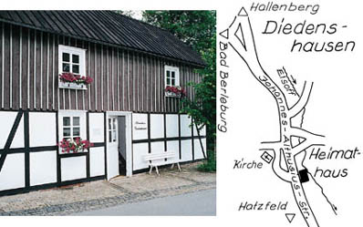Der kleine Ort Diedenshausen an der Grenze zu Hessen ist im Jahre 1194 erstmals urkundlich erwähnt worden. Während das Geschlecht der Ritter von Diedenshausen nach 1400 nicht mehr von sich reden machte, trifft dies auf den "großen Sohn" des Dorfes nicht zu: der Staatsgelehrte Johannes Althusius wurde hier im Jahre 1563 als Sohn eines Müllers geb.. Seine Schrift über die Methode der Politik, in der er die in seinem calvinistischen Glauben wurzelnde Idee der Volkssouveränität entwickelt, beeinflusste gut zweihundert Jahre später die Väter der amerikanischen Verfassung. Das Heimathaus in Diedenshausen präsentiert im Obergeschoss eine kleine Johannes-Althusius-Gedenkstätte. Das Heimathaus ist in einem kleinen, zweistöckigen Gebäude eingerichtet, das vormals als Heuschuppen und Hühnerstall diente. Als herausragende Ausstellungsstücke werden hier der "Setzkeil von Diedenshausen" aus der Jungsteinzeit sowie weitere örtliche Bodenfunde späterer Epochen gezeigt. In der Werkstatt des Uhrmachermeisters Womelsdorf, der sein Handwerk in der Schweiz erlernte, wurden in den Jahren von 1750 bis 1850 zahllose präzise und fein gearbeitete Standuhren gefertigt, die dem Uhrmachermeister wegen der in Deutschland unüblichen schweizerischen Bauweise einen in Fachkreisen beachteten Namen verliehen. Wichtiger Bestandteil der modernen Konzeption des Heimathauses sind die halbjährlich wechselnden Ausstellungen zur Handwerkskultur des Dorfes. Das "Löffelmachen", die Holzbearbeitung zu Gebrauchsgegenständen und Kinderspielzeug, hat auch in Diedenshausen eine lange Tradition und war bis zur Mitte des 20. Jahrhunderts für viele Familien insbesondere während des Winters eine notwendige Nebenerwerbsquelle. Schulklassen aus dem benachbarten Berleburg und dem weiteren Umkreis sowie Besuchergruppen erhalten die Möglichkeit, eines der dörflichen Handwerke jeweils von A-Z kennen zu lernen: die Wollverarbeitung vom Scheren des Schafes über das Waschen, Kämmen und Färben der Wolle bis zu ihrem Verweben. das Schusterhandwerk vom Gerben des Leders über das Zuschneiden der Schnittmuster bis zur Herstellung des fertigen Schuhwerks. die Milchverarbeitung vom Melken der Kuh bis zu den Endprodukten Milch, Butter und Käse. Darüber hinaus besteht ein reichhaltiges Bilder-, Zeitungs-, Literatur- und Dokumentenarchiv, das den Bewohnern des Ortes ermöglicht, die Geschichte des Dorfes und der eigenen Familie zu erforschen. Der auswärtige Besucher hat die Möglichkeit, den Besuch des Museums mit einer Führung durch Diedenshausen zu verbinden, das vor allem wegen seiner liebevoll restaurierten Fachwerkhäuser im Jahre 1998 mit dem Titel "Bundesgolddorf" ausgezeichnet worden ist. (Dieter Pfau in: "Museen und Heimatstuben Siegerland-Wittgenstein").