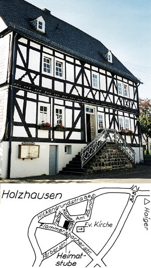 Der Hickengrund war schon früh das Grenzland der Erzbistümer Mainz, Trier und Köln und in heutiger Zeit von drei Bundesländern. Der Ort Holzhausen wurde im Jahre 1326 erstmals urkundlich erwähnt. Die Land- und Forstwirtschaft, der Handel mit Hopfen und weiteren Gütern und später der Bergbau prägten die Erwerbsstruktur des Dorfes. Fuhrleute und Händler aus Holzhausen transportierten Wirtschaftsgüter bis nach Holland. Um 1820 gehörte das Dorf mit über 800 Einwohnern zu den größten Gemeinden des Siegerlandes. Die im Jahre 1769 fertig gestellte Volksschule war über Jahrhunderte ein lebendiger Mittelpunkt des dörflichen Lebens in Holzhausen. Nach einer denkmalgerechten Restaurierung soll die "Alte Schule" heute zu einem kulturellen Dienstleistungszentrum des Ortes werden. Wer das Haus über die sanierte Außentreppe betritt, kommt in die neu gestaltete und mit Feldpflaster ausgelegte Diele. Links von der Diele wurde die alte Raumstruktur des früheren Klassenzimmers wieder hergestellt. Hier befindet sich ein naturkundlicher Arbeits- und Dokumentarraum. Rechts vom Flurbereich sind die Räumlichkeiten für die Seniorenrunde des Heimatvereins mit Gemeinschaftsraum und Küchenbereich hergerichtet worden. Das Raumgefüge im Obergeschoss wird wesentlich durch den Foyerbereich bestimmt, in den eine kleine, aber geräumige Küchenecke - abgetrennt durch eine offene Fachwerkwand - eingebunden ist. Für Seminare, kulturelle Veranstaltungen und kleinere Feierlichkeiten kann die "gute Stube" des Hauses genutzt werden. Auf dem Speicher der "Alten Schule" ist die offene Holztragwerkkonstruktion des Daches und das ursprüngliche Gefache aus Lehm erhalten. Auf der hier bereitgestellten Ausstellungsfläche werden wichtige Etappen der Dorfgeschichte nachgezeichnet und Einblicke in das dörfliche Alltags- und Arbeitsleben vergangener Zeiten gewährt. In diesem museumsbezogenen Teil der "Alten Schule" ist im hinteren Bereich ein kleiner Begegnungs- und Leseraum sowie ein Archivbereich eingerichtet. (Dieter Pfau in: "Museen und Heimatstuben Siegerland-Wittgenstein").