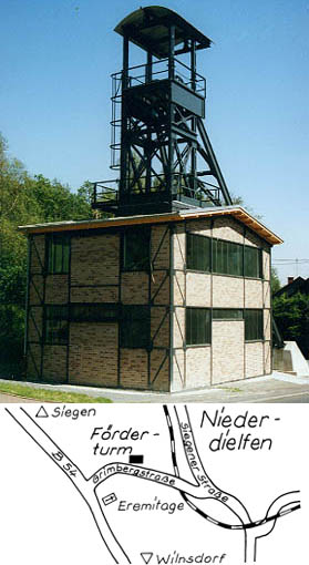 Trotz der großen Erzbergbautradition des Siegerlandes sind im Laufe der Zeit alle vorhandenen Einrichtungen oder Anlagen zur Erzgewinnung beseitigt worden. Allein in der Gemeinde Wilnsdorf gab es acht Gruben, die auch über einen Förderturm verfügten. Auch die Grube Grimberg in Niederdielfen, die von 1807 bis 1911 in Betrieb war, besaß einen Förderturm. 1995 wurde die Grube zu neuem Leben erweckt: Niederdielfen erhielt mit dem Förderturm, der bis dahin auf dem Gelände des ehemaligen Julianschachtes in Bensberg gestanden hatte, ein neues Wahrzeichen. Der rund 16 Meter hohe Förderturm mit Schachtgebäude erinnert nachdrücklich an die Wirtschaftsgeschichte des Siegerlandes. Im Schachtgebäude wurde eine ständige Ausstellung mit zahlreichen Exponaten zur Geschichte des Bergbaus eingerichtet.
