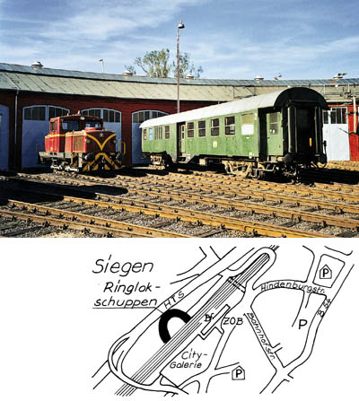 Nach dem Anschluss des Siegerlandes an das deutsche Eisenbahnnetz errichtete die Reichsbahn im Jahre 1870 in Siegen ein Bahnbetriebswerk. Zu den Hochzeiten des Dampflokbetriebes waren hier bis zu 500 Angestellte, Beamte und Arbeiter beschäftigt. Das Kernstück des 1882 erbauten Ringlokschuppens ist eine elektrisch betriebene Drehscheibe mit einem Durchmesser von 23 Metern, die im Jahre 1940 von der Firma Siemag gebaut wurde. Die Drehscheibe dient dazu, die in den einzelnen, fächerartig verteilten Ständen des Lokschuppens zur Wartung oder Reparatur abgestellten Schienenfahrzeuge wieder auf die Gleise des Siegener Bahnhofs zu führen. Seit das Bahnbetriebswerk im Jahre 1997 seine Arbeit eingestellt hat, betreuen die Eisenbahnfreunde Betzdorf e.V. die Anlage. Sie erhalten und restaurieren die Anlage und zusätzlich eine ganze Anzahl alter Dampfloks und Schienenfahrzeuge. Glanzstücke der Sammlung sind die Dampflokomotiven "52 8121-7" und "52 8134-0". Letztere ist derzeit betriebsfähig und wird zu Sonderfahrten in der Region eingesetzt. Die Dampflok "52 8121-7" wurde im Jahre 1943 in Elbing/ Westpreußen gebaut und bis 1961 zwischen Frankfurt/Oder und Berlin sowie rund um Bautzen eingesetzt, bevor sie 1981 in Guben langsam auf den Ruhestand vorbereitet wurde. Die Dampflok "52 8134-0" wurde im Jahre 1943 bei der Wiener Lokfabrik in Wien-Florisdorf gebaut. Sie kam in Chemnitz, Dresden, Hoyerswerda und Kamenz zum Einsatz, bevor sie 1989 zur Ausmusterung zum Reichsbahnbetriebswerk nach Elsterwerda gelangte. Sie war die letzte "Staatsbahn"-Normalspurdampflok des Regelbestandes in Deutschland, die einen planmäßigen Personenzug befördert hat. Zum Wagenbestand der Eisenbahnfreunde zählen darüber hinaus drei Köf (= Kleinlok ölfeuernd), zwei weitere Kleinloks, eine Bahnmeister-Draisine (angetrieben von einem VW-Käfer-Motor) mit dem Spitznamen "Charly" sowie mehrere, größtenteils betriebsfähige drei- und vierachsige Personen- und Güterwagen. Die Fahrzeuge werden im Lokschuppen aufgearbeitet und gewartet. Regelmäßige Vorführungen von Lokomotiven und anderen Bahnfahrzeugen finden anlässlich des jährlichen Lokschuppenfestes statt, an dem das gesamte ehemalige Bahnbetriebswerk für den Publikumsverkehr geöffnet ist. Im hinteren Bereich des Bahnbetriebswerks ist ein Ausstellungsraum eingerichtet, in dem eine umfangreich ausgestattete Modelleisenbahn-Anlage sowie Dokumente und Bilder aus der Geschichte des Siegener Bahnbetriebswerks zu finden sind. (Dieter Pfau in: "Museen und Heimatstuben Siegerland-Wittgenstein").