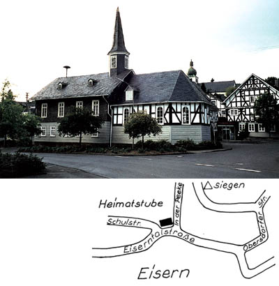 "Eisern, heute Stadtteil von Siegen, war früher ein Bergmannsdorf. Nach der in den letzten Jahren erfolgten Renovierung der Kapellenschule wurde der ehemalige Schulsaal als Heimatstube ausgebaut. Hier sind Exponate aus der bergmännischen Tätigkeit unserer Vorfahren zu sehen, Arbeitsgeräte und Gebrauchsgegenstände, dazu Mineralien - aber auch Gerätschaften aus Landwirtschaft und Hauberg.