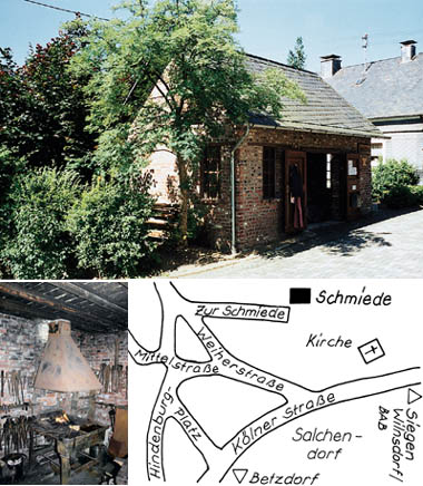"Droure Schmedde" - so wird die Dorfschmiede in Salchendorf im Volksmund genannt. "Droure Willem" war der Rufname des Fuhrunternehmers Wilhelm Schneider, der die Huf- und Wagenschmiede im Jahre 1933 im alten Ortskern von Salchendorf errichtete. Das kleine rechteckige Backsteingebäude (Außenmaße 6,70 x 4,25 m) mit Giebelfachwerk wurde von Mitgliedern des Heimatvereins renoviert und im Jahre 1993 seiner neuen Bestimmung übergeben: das Schmiedehandwerk der Vorfahren den nachfolgenden Generationen, insbesondere auch Kindern und Jugendlichen, zu erhalten und näher zu bringen. In der Schmiede wurden Pferde, Ochsen und auch als Zugtiere eingesetzte Kühe beschlagen, eiserne Beschläge und Felgen für Transportmittel hergestellt, Werkzeuge für Landwirtschaft und Hauberg gefertigt, repariert und bei Bedarf gehärtet. Große und kleine Werkzeuge gehören zur Ausstattung der Schmiede: ein mächtiger Amboss auf einem Holzuntersatz, um die Hammerschläge abzufedern. eine Auswahl verschieden schwerer Hämmer (kleiner und großer Schmiedehammer, Vorschlaghammer, Kreuzschlaghammer im Gewicht von 1 bis 6 kg). funktionsgerechte, selbst gefertigte Zangen (Feuerzange, Flachzange, Rundzange, Wolfsmaul und Spitzzange). ein Feuer- oder Schmiedeschraubstock sowie eine ganze Anzahl von kleinen, verschieden geformten Eisenstücken (Stöckel genannt), mit deren Hilfe das Eisen während des Schmiedevorgangs gebogen werden kann. Neben der Aufarbeitung von Gartenwerkzeugen oder Haubergsmessern werden in der Schmiede heute auch verschiedene Kunstschmiedeprodukte gefertigt, vom Kerzenständer bis zu kleinen Tiermotiven. Regelmäßig wird in und um die alte Schmiede in Salchendorf ein Schmiedefest veranstaltet.