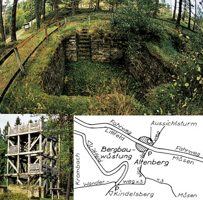 "Als sinnvolle Ergänzung zum Bergbaumuseum und Schaubergwerk `Stahlberger Erbstollen` in Hilchenbach-Müsen bietet sich dem Besucher die Freiluftanlage `Ausgrabungsgelände Bergbausiedlung Altenberg` an. Heimatforscher und Archäologen haben hier auf der Bergkuppe die Überreste einer mittelalterlichen Wohn- und Arbeitsstadt von Berg- und Hüttenleuten freigelegt. Die Wohnhäuser, Lagerräume und Werkstätten aus dem 13. Jahrhundert befanden sich in unmittelbarer Nähe zu den Arbeitsstätten der Bergleute, die heimische Erze abbauten und verarbeiteten. Den Anstoß zur Suche nach der alten Bergbausiedlung lieferte den Heimatforschern eine alte Sage, die erzählt, dass es eine Stadt gegeben haben soll, deren Einwohner Reichtum aus dem Silberbergbau erwarben, schließlich jedoch den Zorn Gottes auf sich lenkten, weil sie der Reichtum hochmütig gemacht hatte, so dass schließlich die ganze Stadt zur Strafe durch ein großes Feuer vernichtet wurde."