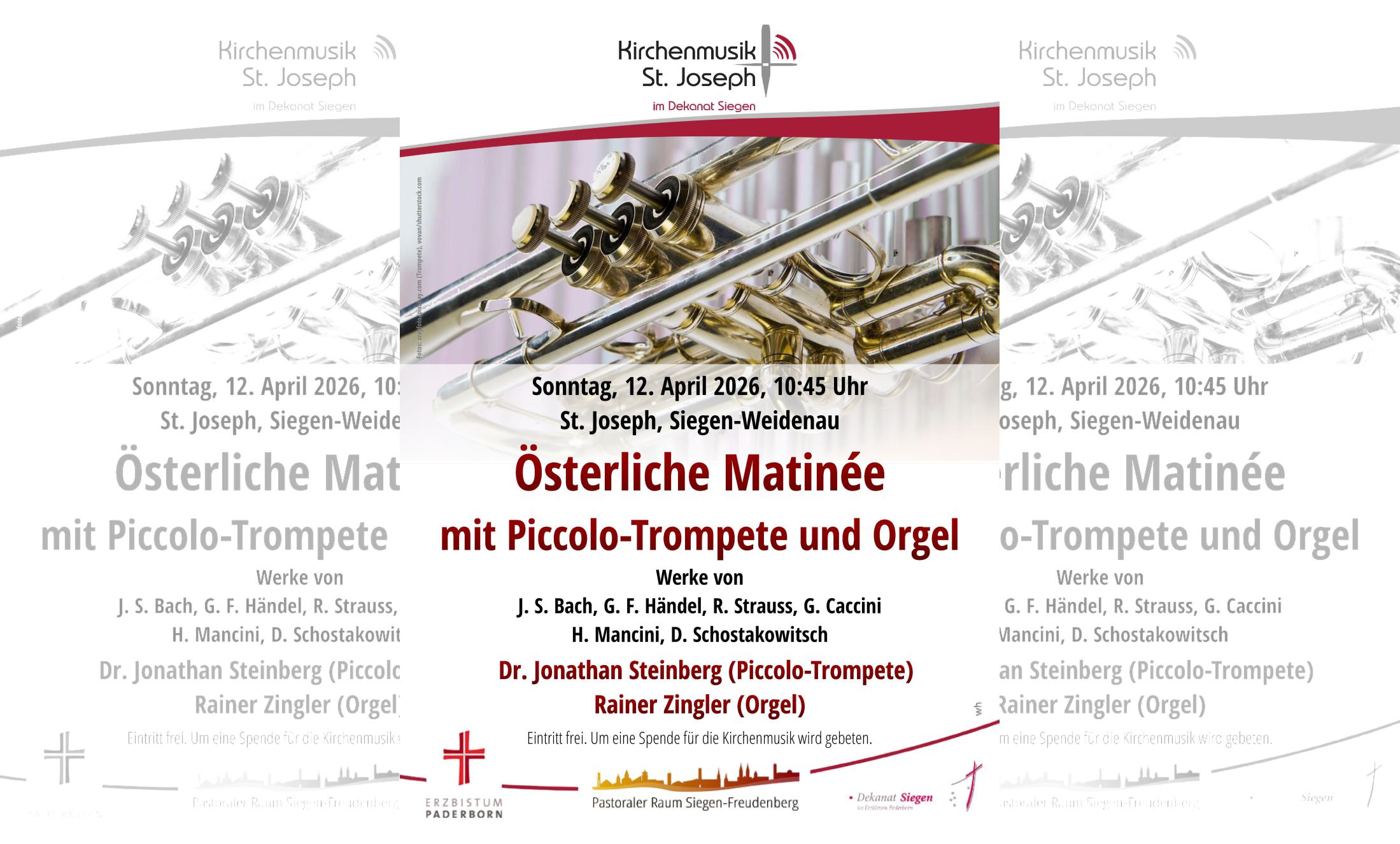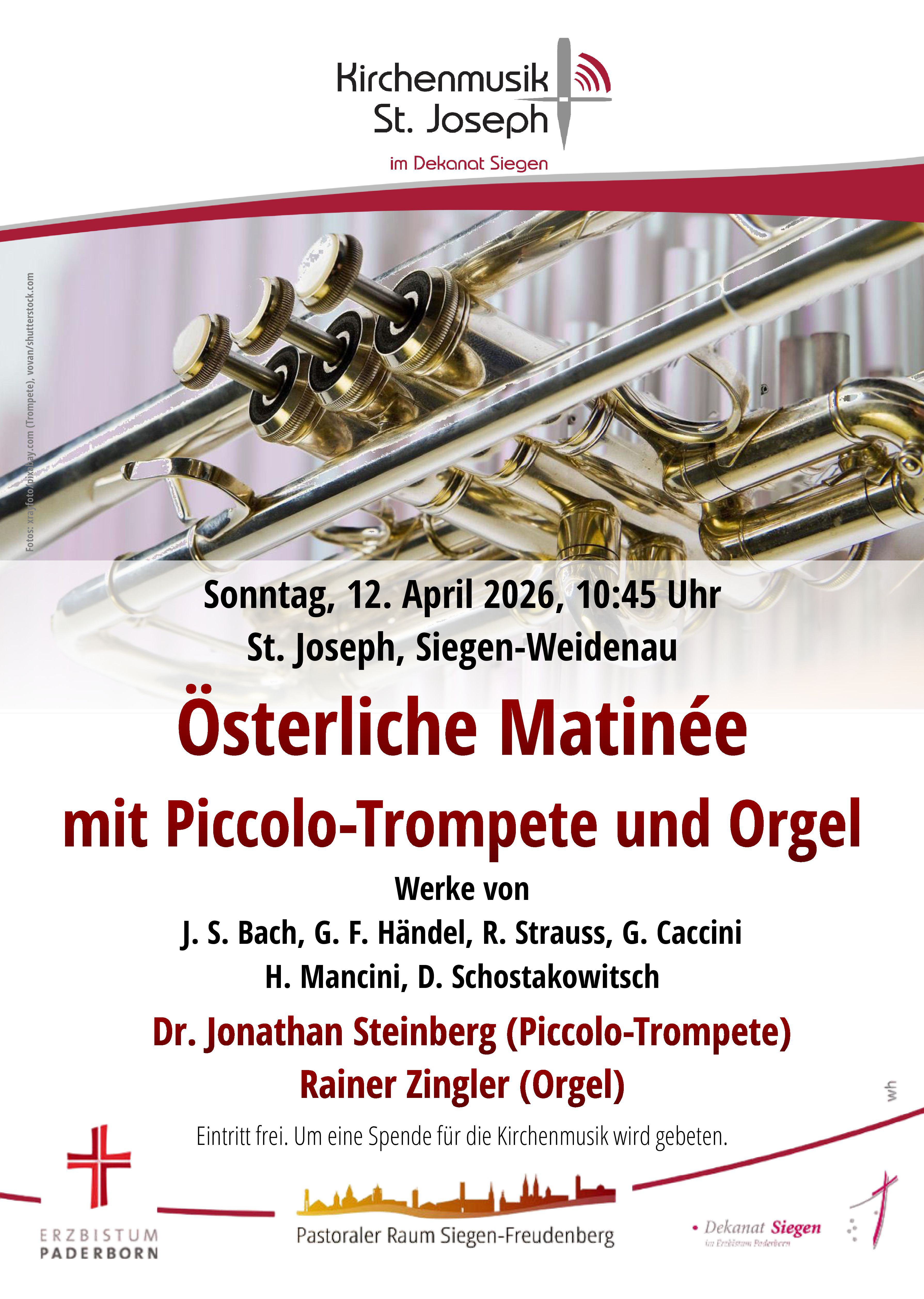 Wenn es festlich werden soll, dann braucht es eine Trompete. Rainer Zingler aus Grevenbrück (Orgel) und Dr. Jonathan Steinberg aus München (Piccolo-Trompete) in St. Joseph, Weidenauer Straße, spielen Werke von Johann Sebastian Bach, Georg Friedrich Händel, Richard Strauss, Giulio Caccini, Henry Mancini und Dmitri Schostakowitsch. Der Eintritt ist frei.Am Ausgang wird um eine Spende zugunsten der Kirchenmusik in St. Joseph gebeten.