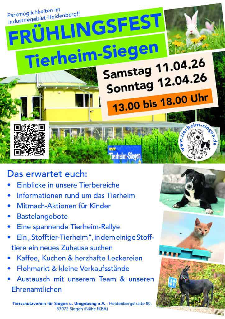 Der Frühling steht vor der Tür – und das möchten wir gemeinsam mit euch feiern! Wir laden herzlich ein zu unserem Frühlingsfest im Tierheim Siegen. Freut euch auf einen bunten Tag mit tierischen Begegnungen, netten Gesprächen und spannenden Einblicken in unsere Arbeit. Das erwartet euch: Einblicke in unsere Tierbereiche - Informationen rund um Tierschutz & Tiervermittlung - Mitmach-Aktionen für Kinder - Bastelangebote Eine spannende Tierheim-Rallye - Ein „Stofftier-Tierheim“, in dem einige Stofftiere ein neues Zuhause suchen - Kaffee, Kuchen & herzhafte Leckereien - Flohmarkt & kleine Verkaufsstände - Austausch mit unserem Team & unseren Ehrenamtlichen. Unser Frühlingsfest ist die perfekte Gelegenheit, das Tierheim ganz entspannt kennenzulernen, Fragen zu stellen und vielleicht sogar euer neues Familienmitglied zu entdecken. Mit eurem Besuch unterstützt ihr direkt unsere Tiere – denn jeder Kaffee, jedes Stück Kuchen und jede Spende helfen uns, weiterhin für Hunde, Katzen und unsere Großtiere da zu sein.