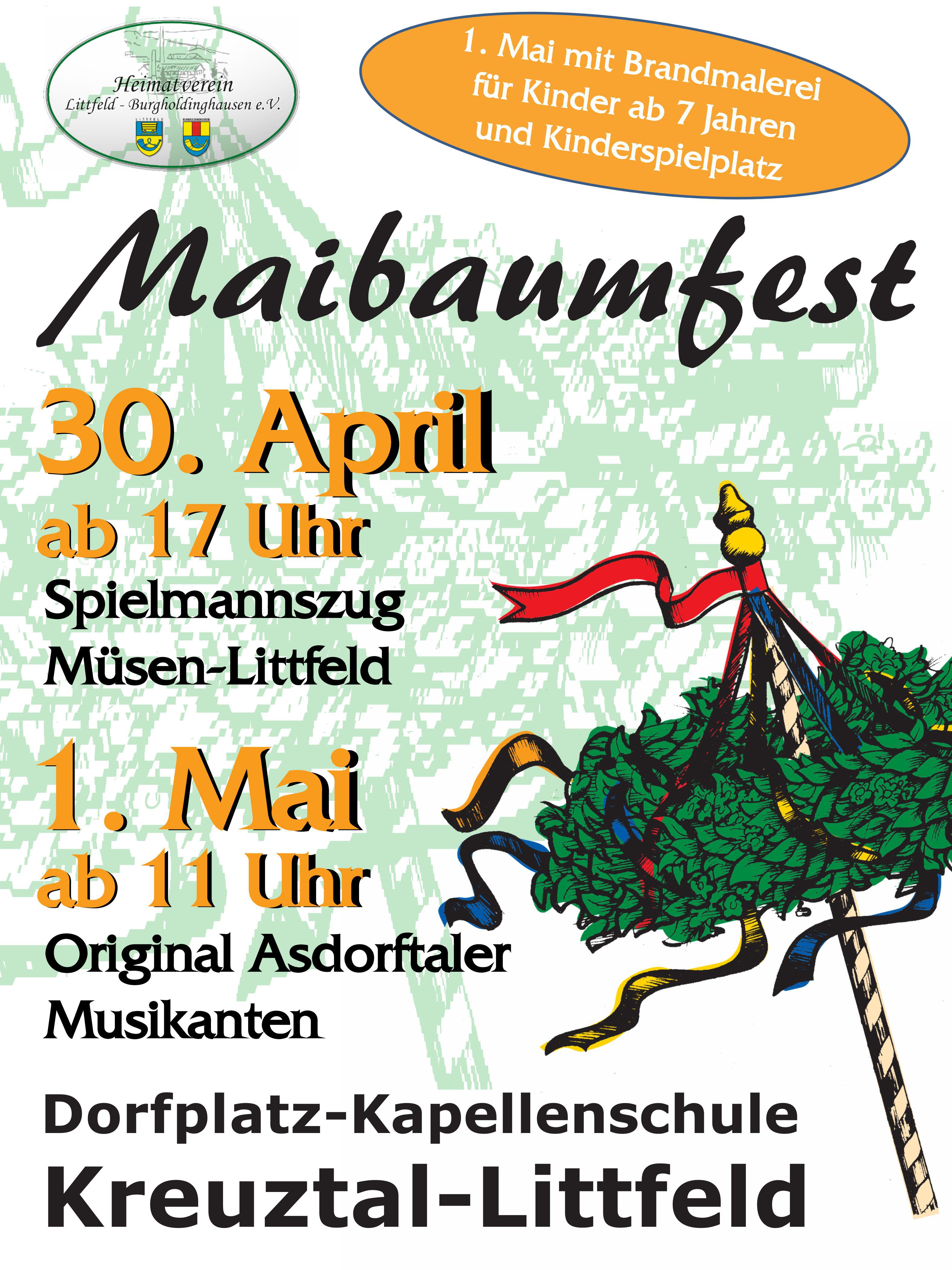 Maifeier mit Speise- und Getränkeangebot, Brandmalerei für Kinder ab 7 Jahren und einem Kinderspielplatz und musikalischer Unterhaltung am 30.04., ab 17.00 Uhr, durch den Spielmannszug Müsen-Littfeld und am 01.05., ab 11.30 Uhr, durch die Original Adorftaler.