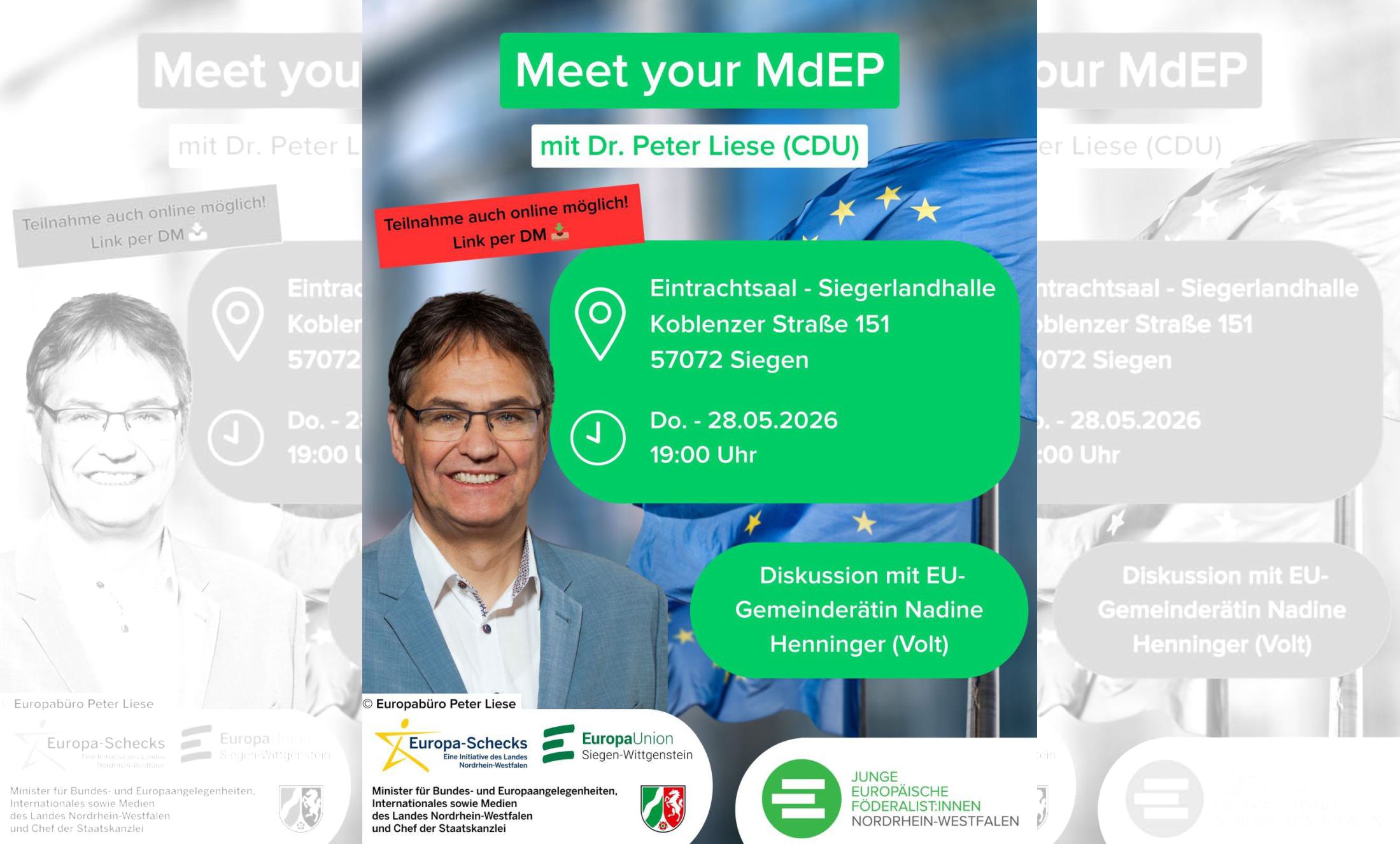 Universitätsstadt Siegen, Nadine Henniger (Volt) herzlich zur Dialog-Veranstaltung "Meet your MdEP" mit Dr. Peter Liese (CDU) ein. Die Teilnahme ist kostenlos. Zur besseren Planbarkeit würden wir uns über eine Anmeldung vorab freuen.