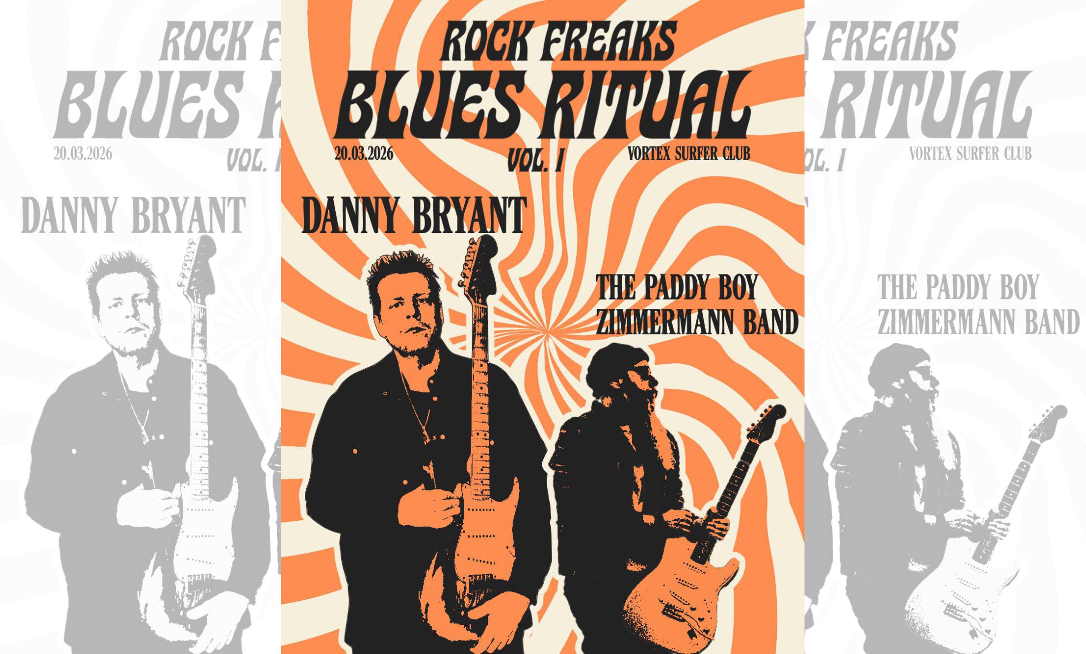 Rock Freaks eine neue Reihe im Vortex Surfer Club – ehrlich, elektrisch, intensiv. Kein Retro-Zirkus, sondern Blues als lebendige, brennende Kunstform. | DANNY BRYANT (UK) Danny Bryant steht seit Jahren für einen modernen, kompromisslosen Blues, der tief in der Tradition wurzelt, aber nie stehen bleibt. Seine Songs sind persönlich, rau und emotional, sein Gitarrenspiel kraftvoll und voller Ausdruck. Bryant spielt nicht nur Blues – er lebt ihn. Wer ihn einmal live erlebt hat, weiß: Das ist keine Show, das ist ein Statement. Große Songs, große Gefühle, große Momente. | THE PADDY BOY ZIMMERMANN BAND Paddy Boy Zimmermann gehört zu den authentischsten Blues-Musikern hierzulande. Mit seiner Band bringt er erdigen Blues Rock auf die Bühne, der Groove, Tiefe und echte Spielfreude vereint. Zwischen knarzender Gitarre, rauer Stimme und einer Band, die atmet wie ein Organismus, entsteht ein Sound, der gleichermaßen traditionell wie zeitlos ist – direkt, ehrlich, ohne doppelten Boden. Zwei Acts, die Blues nicht erklären müssen. Zwei Gitarren, zwei Handschriften, eine gemeinsame Leidenschaft. Bluesige Psychedelic-Vibes, hypnotische Riffs, kalte Drinks und ein Abend, der mehr Ritual als Konzert ist. Vol. I ist der Anfang. Pflichttermin für Blues-, Rock- und Freaks-Freunde
