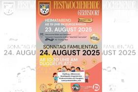Der Heimat- und Wanderverein Gernsdorf e.V. feiert das 725-jährige Dorfjubiläum mit einem zweitägigen Programm. Der Samstagabend im Bürgerhaus bietet einen „Heimatabend“ mit historischen Bildern, Chormusik und Live-Auftritt der Band Frumpy Man. Am Sonntag folgt ein Familientag mit Spiel- und Sportangeboten, Vorführungen, Musikbeiträgen und Mitmachaktionen für alle Altersgruppen. Der Eintritt ist frei.
