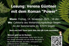 Der Roman Power erzählt die Geschichte des verschwundenen Hundes Power und der Suche seiner Besitzerin Kerze. Auf eindringliche Weise verwandelt sich diese Suche in eine kollektive Bewegung: Die Kinder des Dorfes folgen Kerze in eine Art Kinderhunderudel, das gesellschaftliche Normen infrage stellt. Güntners Werk ist ein tiefgründiger, zugleich poetischer Roman über Macht, Gemeinschaft und das Überschreiten von Grenzen – und ein Blick auf Grenzen und Außenseiter/n der Gesellschaft. Die Lesung wird von Studierenden des Weiterbildungskollegs Siegen organisiert, die sich auf dem Weg zum Abitur befinden oder ihren Schulabschluss nachholen. Das Projekt bietet ihnen die Möglichkeit, Literatur aktiv zu erleben und gemeinsam mit dem Publikum Fragen nach Verantwortung, Zugehörigkeit und gesellschaftlichem Zusammenhalt zu ergründen. Wir freuen uns über viele aktive Teilnehmer*innen! Im Anschluss an die Veranstaltung besteht die Gelegenheit, Bücher der Autorin vor Ort zu erwerben. Das wird von der "Buchhandlung Bücherkiste" aus Weidenau organisiert.
